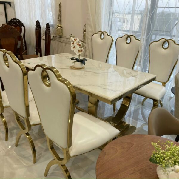 Chất liệu: Bàn ăn đá nhập khẩu, mặt đá ceramic cao cấp, khung chân inox 201 mạ vàng