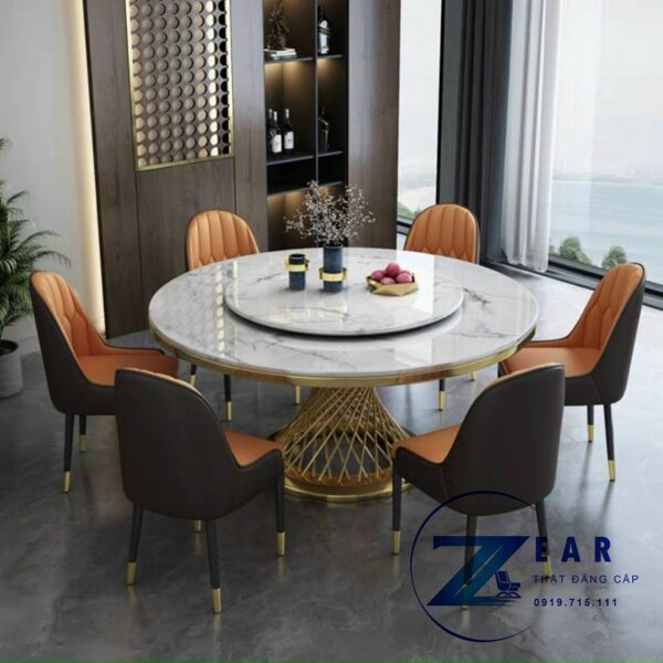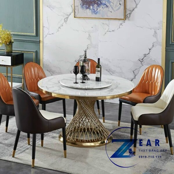 Chất liệu: Mặt bàn đá ceramic nhập khẩu cao cấp. chân bàn mạ vàng 24k. Ghế da nhập khẩu cao cấp