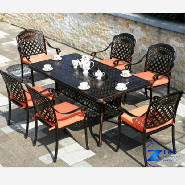 Bộ bàn được làm từ nhôm đúc chất lượng cao có lợp sơn tĩnh điện. Với chất liệu này giúp bộ bàn chống chống nước, chống gỉ dưới môi trường ngoài trời.