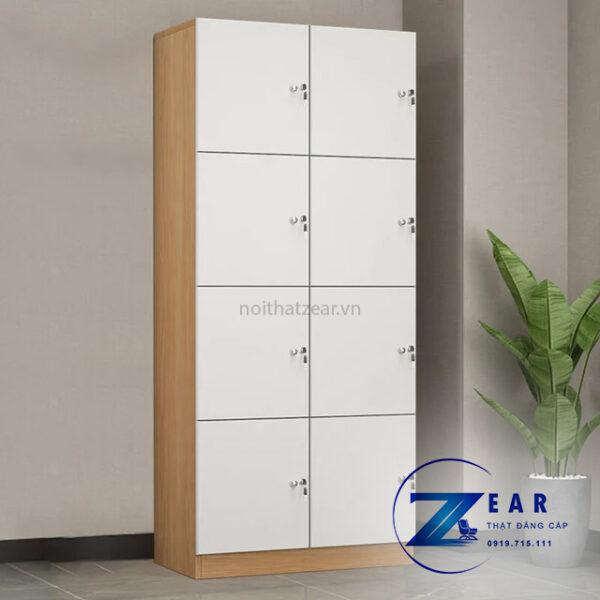 Chất liệu: Gỗ MDF lõi xanh chống ẩm phủ melamin chống trầy cao cấp. Tủ được thiết kế 8 ô có khóa riêng biệt